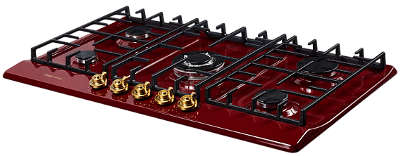 Эта модель сразу привлекает внимание своим глубоким бордовым оттенком, который гармонично сочетается с элементами бронзового цвета на управляющих деталях. Такая комбинация смотрится выразительно и подчеркивает индивидуальность пространства, особенно если вы цените классические мотивы в оформлении кухни. Эмалевая поверхность конфорочной панели отличается не только насыщенным тоном, но и легкостью ухода — пятна и следы от готовки удаляются без лишних усилий. Окантовка со скошенным краем придаёт устройству аккуратный, завершённый вид, а чугунные решётки обеспечивают устойчивость даже для тяжёлой посуды.