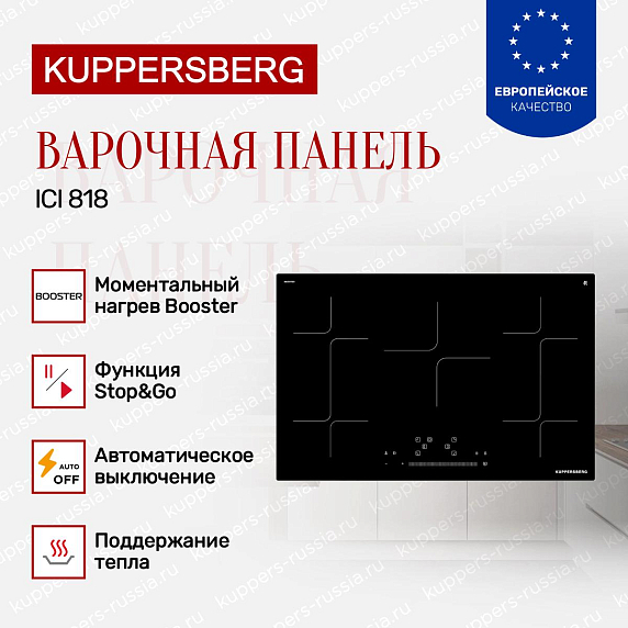 Индукционная варочная панель Kuppersberg ICI 818 — решение для тех, кто ценит современный стиль и продуманную функциональность на кухне. Черная стеклокерамическая поверхность с прямым краем и черной фурнитурой выглядит лаконично и легко вписывается в любой интерьер, от минимализма до классики. Компактная по высоте конструкция 6 см делает встраивание аккуратным и незаметным.