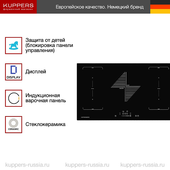- Пять независимых зон нагрева позволяют готовить разные блюда одновременно.