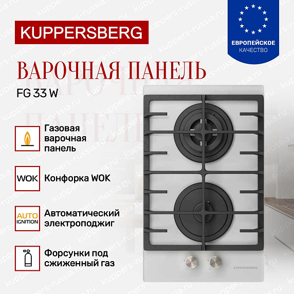 Ключевым достоинством Kuppersberg FG 33 W является уменьшенная ширина 32 сантиметра в формате «Домино» при сохранении полноценной работоспособности двухконфорочной газовой панели в светлом цветовом исполнении. Подобный формат оптимален для малогабаритных кухонь, студийных помещений и встроенных зон, где установка стандартной 50-сантиметровой панели невозможна. Газовый способ нагрева обеспечивает быстроту и экономичность, сопоставимую с более крупными агрегатами.