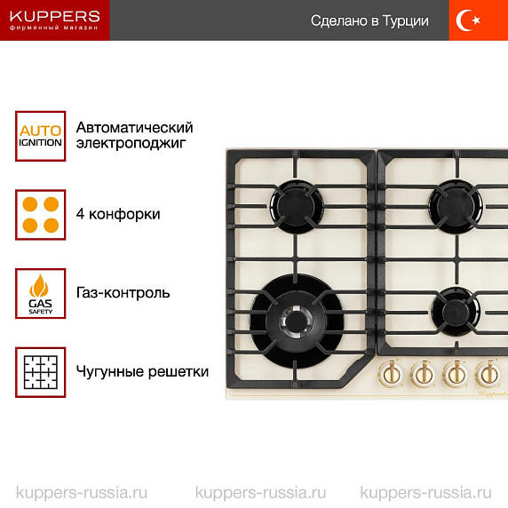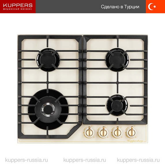Варочная панель Kuppersberg FG 603 C Bronze — качественное, надежное и безопасное устройство для приготовления пищи. Оно выполнено в ретро-стиле. Поверхность цвета слоновой кости эффектно оттеняют бронзовые переключатели и тонкая полоса краски, а также фирменный логотип бренда. Покрытие не стирается даже при многократном использовании и мытье. Конструкция предполагает наличие двух чугунных решеток, на которые ставится посуда. Они сделаны так, чтобы расположить можно было одновременно большие и маленькие кастрюли, сковороды, даже жаровни и турки. Черный металл очень прочный, не подвержен воздействию температуры. При этом легко очищается даже при сильных загрязнениях. Решетки снимаются. Закаленное стекло варочной поверхности устойчиво к царапинам. Оно не выгорает, его можно мыть почти любыми средствами.