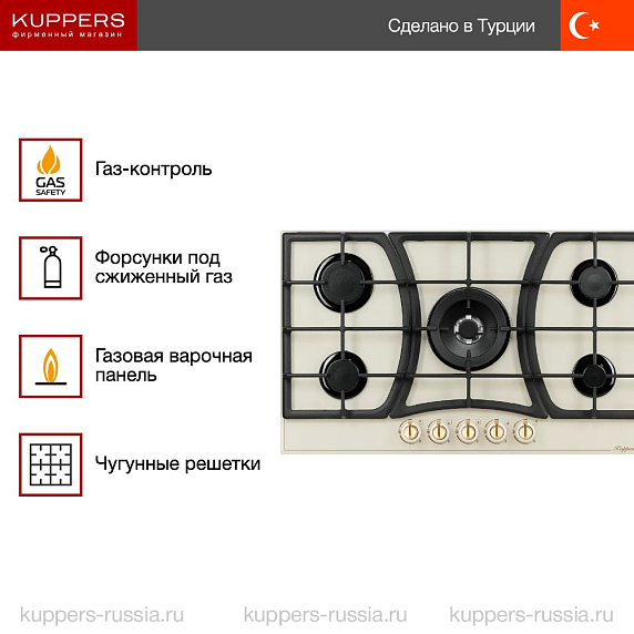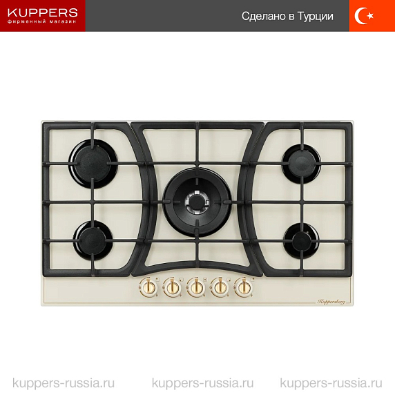 Варочная панель Kuppersberg FG 903 C Bronze — это идеальное решение для тех, кто хочет обновить свою кухню, используя надежную, функциональную, современную и безопасную технику. Эта модель от известного производителя отличается не только своим сдержанным дизайном, элегантным бежевым цветом и изысканной фурнитурой в оттенке бронзы, но и высокой функциональностью. Прежде всего, стоит отметить, что плита имеет пять конфорок, что позволит вам готовить одновременно несколько блюд. Это особенно полезно для больших семей или тех, кто любит делать много гарниров или супов за раз. Съемные чугунные решетки обеспечивают надежную установку кастрюль, сковородок и жаровен разного диаметра.