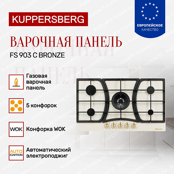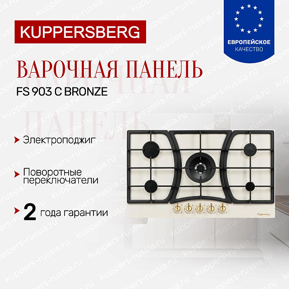 Варочная панель Kuppersberg FS 903 C Bronze — это стильный и надежный помощник для приготовления еды, выполненный в классическом дизайне. Цвет поверхности слоновая кость прекрасно сочетается с бронзовыми ручками управления. Такое покрытие легко выдерживает ежедневное использование и без проблем моется. Эта модель оснащена съемной чугунной решеткой для размещения посуды. Она сконструирована так, что на ней можно одновременно ставить большие и маленькие кастрюли, сковороды, жаровни и даже гейзерную кофеварку с маленьким диаметром дна. Решетки сделаны из прочного металла и выдерживают высокую температуру. С течением времени они не станут более хрупкими, а значит, пользоваться плитой будет все так же безопасно.