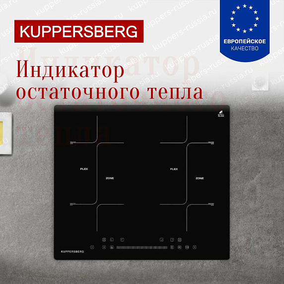 Индикаторы остаточного тепла показывают, какая из зон еще не остыла после окончания приготовления, что защищает от случайных ожогов. Индикатор гаснет после того, как температура поверхности опуститься ниже 60°С.