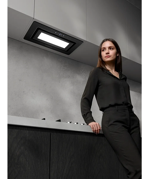 Вытяжка Kuppersberg INSHINE 60 BG оснащена современным и одновременно сдержанным корпусом, он подчёркивает минималистичный подход к оформлению кухни, где важны функциональность и аккуратность линий. Чёрная отделка придаёт атмосфере глубину, а лаконичные геометрические элементы создают эффект целостности, вписывая технику в интерьеры различных стилей — от строгого хай-тека до тёплого минимализма. Низкий профиль при высоте 27.5 см делает изделие практически незаметным при монтаже в подвесной шкаф, оставляя простор для кухонного дизайна и позволяя сохранить единство фасадов. Ширина 52 см и глубина 28.5 см рассчитаны на стандартные модульные решения, а габариты ниши для встраивания 26 х 49 х 40 см облегчают подготовку места и ускоряют установку.