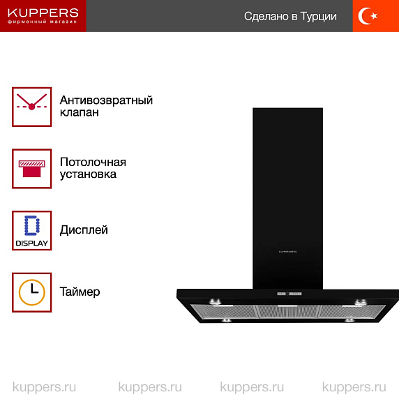 Эта модель сразу привлекает внимание своим лаконичным внешним видом: корпус выполнен в насыщенном темном цвете, который гармонично сочетается с различными стилями оформления кухни. Благодаря сдержанному оформлению и плавным линиям устройство будет органично смотреться как в просторных, так и в компактных помещениях. Островная конструкция и потолочный способ крепления позволяют разместить вытяжку над варочной поверхностью в центре помещения, что особенно удобно в открытых кухонных пространствах.