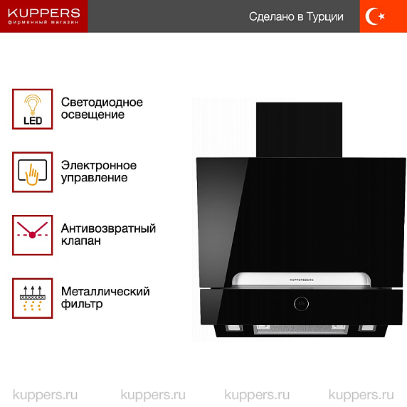 Наклонная вытяжка Kuppersberg F 690, выполненная в современном стиле, представлена в цвете "черное стекло", благодаря чему лаконично впишется в любой интерьер.