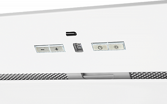 Вытяжка выполнена в универсальном белом цвете, который легко интегрируется в любую цветовую гамму кухонного гарнитура — от пастельных тонов до контрастных комбинаций. Нижняя панель управления оснащена тактильными кнопками с чёткой маркировкой и небольшим LED-дисплеем, отображающим текущую скорость, режим работы и таймер. Подсветка кнопок обеспечивает удобство даже в условиях приглушённого освещения. Продуманное расположение элементов управления позволяет управлять устройством без необходимости открывать шкаф — всё находится под рукой.