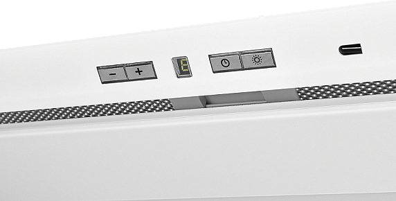 Корпус вытяжки изготовлен из комбинации высококачественного пластика и металлических компонентов. Белая передняя панель устойчива к царапинам и легко очищается от жировых брызг и отпечатков пальцев — достаточно протереть её мягкой тканью с нейтральным моющим средством. Внутренние элементы, включая жировой фильтр, выполнены из нержавеющей стали, что обеспечивает долговечность, устойчивость к коррозии и возможность многократной очистки (в том числе в посудомоечной машине). Пластиковые части используются в зонах, не подверженных прямому воздействию пара и высоких температур, что позволяет сохранить баланс между надёжностью и весом конструкции.