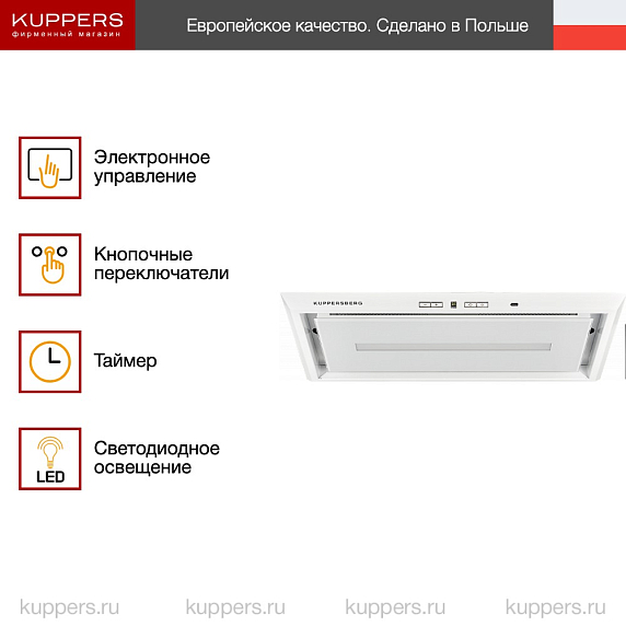 Вытяжка Купперсберг Inbox 54 W — это продуманное, тихое и эстетичное решение для современной кухни. Белый корпус, компактные размеры, высокая производительность и низкий уровень шума делают эту модель особенно привлекательной для владельцев светлых интерьеров и небольших помещений.