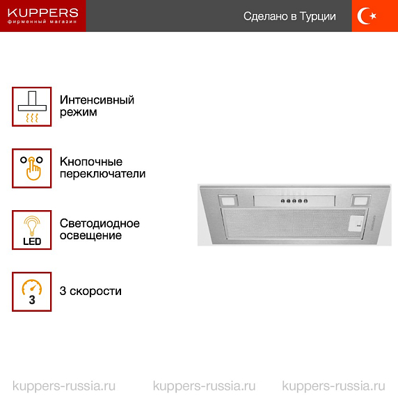 Тип: встраиваемая, Ширина, см: 52.5, Количество скоростей: 3, Освещение: светодиодное, Производительность, м³/ч: 1300, Уровень шума, дБ: 39