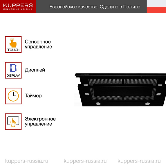 Модель выполнена в строгом матовом чёрном цвете, который органично вписывается в интерьеры в стилях лофт, минимализм, хай-тек и даже неоклассика. Такое цветовое решение не только подчёркивает лаконичность линий, но и визуально «растворяет» технику в фасаде, не нарушая гармонии кухонного гарнитура. Управление вытяжкой реализовано через сенсорную панель с цифровым дисплеем, что придаёт устройству технологичный вид и обеспечивает высокую точность настройки. Корпус изготовлен из высококачественного термостойкого пластика с матовым покрытием, устойчивым к царапинам, жировым отложениям и УФ-воздействию. Жироулавливающий фильтр — металлический, многослойный, с ячеистой структурой, что значительно повышает эффективность удержания жировых частиц. Его можно многократно очищать в посудомоечной машине без потери эксплуатационных свойств. Стеклянные элементы в конструкции отсутствуют — это сознательный выбор, направленный на упрощение ухода и повышение долговечности. Выдвижная панель, увеличивающая зону захвата пара, выполнена из того же прочного пластика и оснащена плавным, бесшумным ходом.