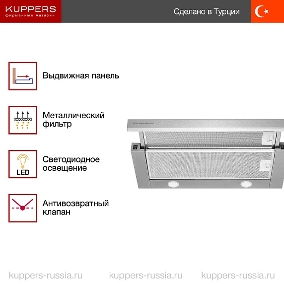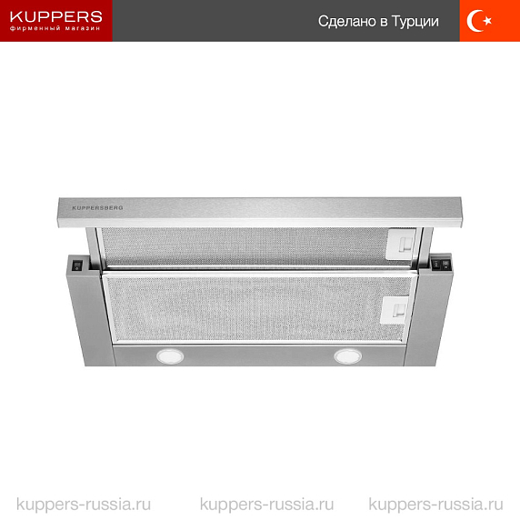 В основе конструкции — механическое управление с кнопочными переключателями. Такой способ управления интуитивно понятен и не требует привыкания, а три скорости позволяют подобрать оптимальный режим для разных кулинарных задач. Например, при интенсивном жарении можно включить максимальную производительность, а для легкого проветривания — выбрать экономичный режим. Металлический фильтр эффективно задерживает жир и легко очищается, сохраняя работоспособность вытяжки. Для дополнительной фильтрации запахов предусмотрена возможность установки угольного фильтра Kuppersberg KF-Y (приобретается отдельно).
