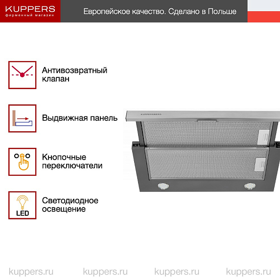 Вытяжка Купперсберг Slimlux IV 60 X — это продуманное решение для тех, кто ценит функциональность, компактность и эстетику на кухне. Несмотря на скромные габариты, модель предлагает высокую производительность, надёжные материалы и удобное управление.
