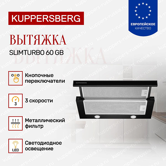 Вытяжка Kuppersberg SLIMTURBO 60 GB — превосходное решение для вашей кухни. Модель выполнена в современном дизайне и подойдет к любому интерьеру. Черный оттенок и металлический корпус придают устройству элегантный стильный вид. Материал не меняет цвет со временем, не деформируется под воздействием влаги и от перепадов температур. Встраиваемая конструкция подходит для небольших комнат. Корпус полностью убирается в шкаф, снаружи остается только рабочая поверхность. Прибор сочетается как с классическими, так и с современными гарнитурами. Он поможет вам создать благоприятный микроклимат на кухне.