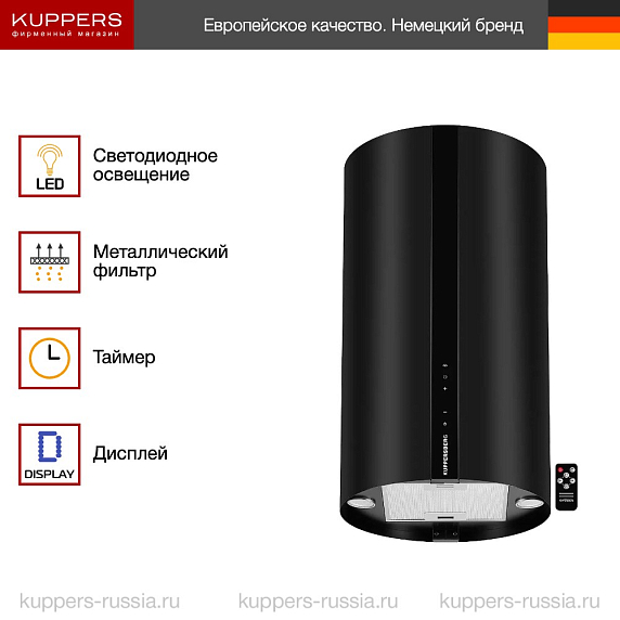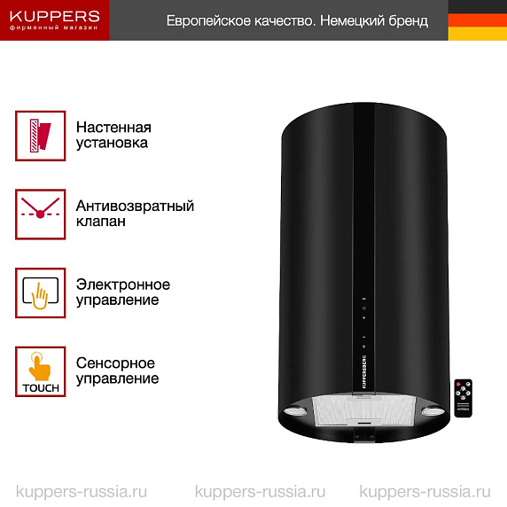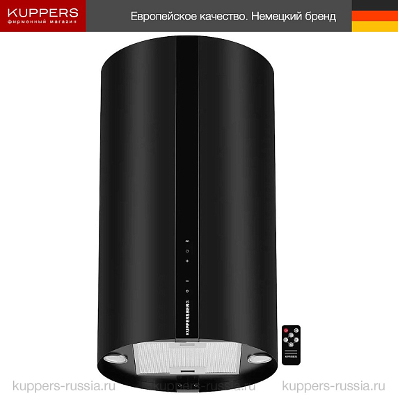 Эта вытяжка выполнена в актуальной цилиндрической форме и отличается лаконичным внешним видом. Благодаря насыщенному темному цвету корпус гармонично сочетается с разными вариантами оформления кухни, будь то минимализм, хай-тек или строгая классика. Устройство крепится к стене, а его габариты — высота 70 см, ширина 40,5 см и глубина 46,5 см — позволяют органично вписать вытяжку даже в ограниченное пространство, не перегружая интерьер.