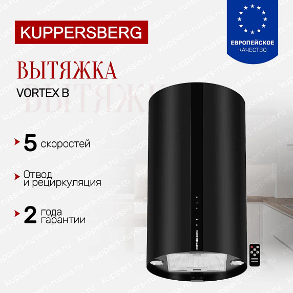 Вытяжка Kuppersberg VORTEX B представляет собой практичное и надежное оборудование для современных кухонь, объединяющее стильное оформление, высокую производительность и расширенные возможности управления. Возможность работы в режимах отвода и рециркуляции, пять скоростей вентиляции, электронное управление с сенсорными переключателями, дисплеем, таймером и пультом дистанционного управления, а также комфортный уровень шума делают данную модель функциональным решением для ежедневного применения. Оригинальная цилиндрическая форма позволяет устройству выгодно подчеркивать современный интерьер кухни. Поставка осуществляется через официальную дилерскую сеть, что подтверждает подлинность изделия и наличие гарантийных обязательств производителя.
