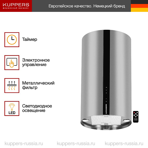 Вытяжка Kuppersberg — это современный прибор, способный работать в разных режимах, с разными скоростями, оснащенный источниками подсветки и обладающий защитными функциями. Включать/выключать вытяжку и выбирать нужные опции можно как с помощью элементов управления, расположенных непосредственно на корпусе прибора, так и с помощью удобного пульта дистанционного управления эргономичной формы.