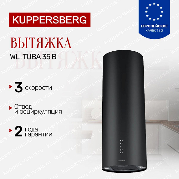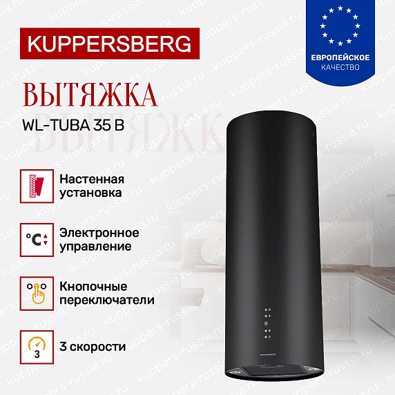 Вытяжка Kuppersberg WL TUBA 35 B - эта модель привлекает внимание продуманной формой: цилиндрический корпус в строгом черном исполнении гармонично вписывается в интерьер современных кухонь. Высота 93 см создает визуальную вертикальную доминанту, которая одновременно служит функциональным элементом — компактный профиль шириной 35,1 см и глубиной 35,1 см занимает мало места, но при этом обеспечивает высокий воздухообмен. Настенный монтаж делает прибор универсальным для различных планировок: он легко крепится над варочной зоной и становится органичной частью оформления, подчеркивая минималистичную эстетику коллекции «Современный дизайн». Черный цвет корпуса добавляет солидности и позволяет сочетать устройство с техникой в темных тонах или контрастировать с яркой мебелью.