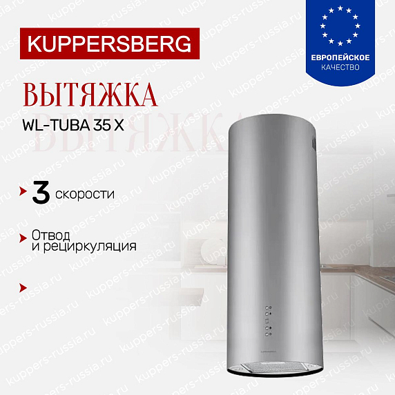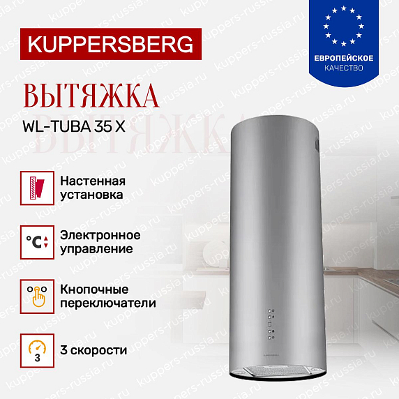 Вытяжка Kuppersberg WL TUBA 35 X - эта цилиндрическая модель создана для ценителей компактных решений с выразительным современным характером: цвет нержавеющая сталь и гладкая геометрия форм формируют минималистичную композицию, рассчитанную на настенный монтаж и органичную интеграцию в актуальные интерьерные сценарии. Высота конструкции составляет 93 см при габаритах 35.1 × 35.1 см по ширине и глубине, диаметр воздуховода — 15 см, что делает изделие удобным для подсоединения к типовым вентиляционным системам и сохранения свободного пространства над рабочей зоной. Лаконичная цилиндрическая колонна одновременно выполняет роль функционального узла и декоративного акцента, подчеркивая стиль коллекции «Современный дизайн» и придавая помещению завершённый вид.