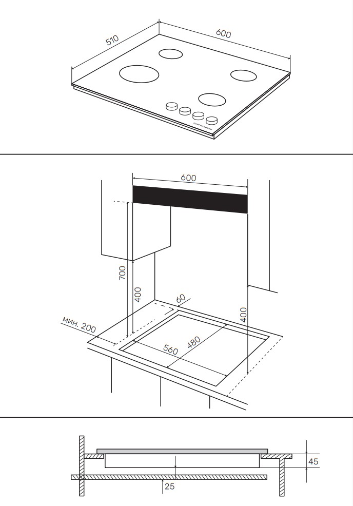 Схема встраивания для варочной панели Kuppersberg FG 61 B