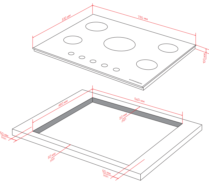 Схема встраивания для варочной панели Kuppersberg TG 72 B