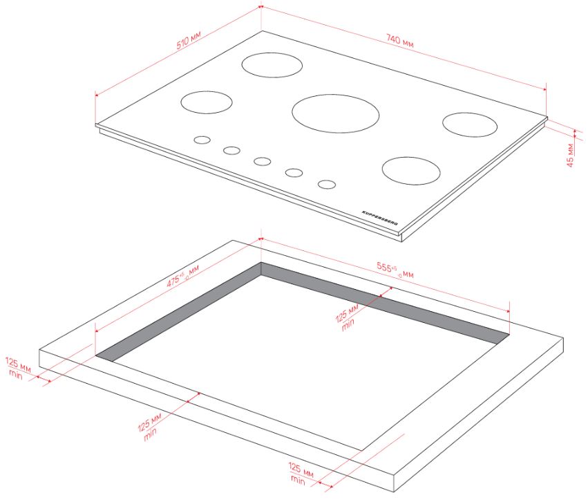 Схема встраивания для варочной панели Kuppersberg FG 76 W