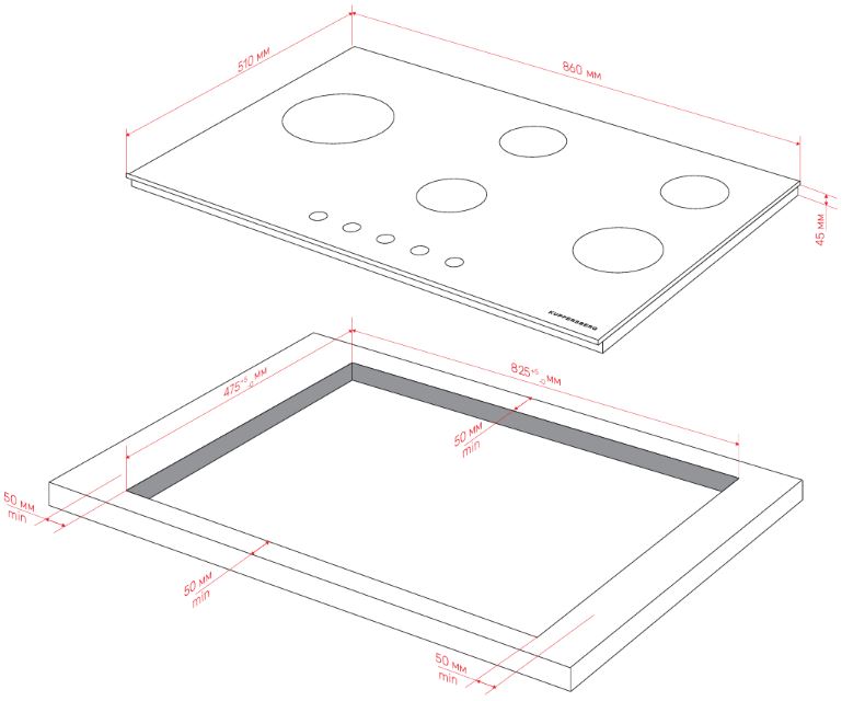 Схема встраивания для варочной панели Kuppersberg FG 96 BG