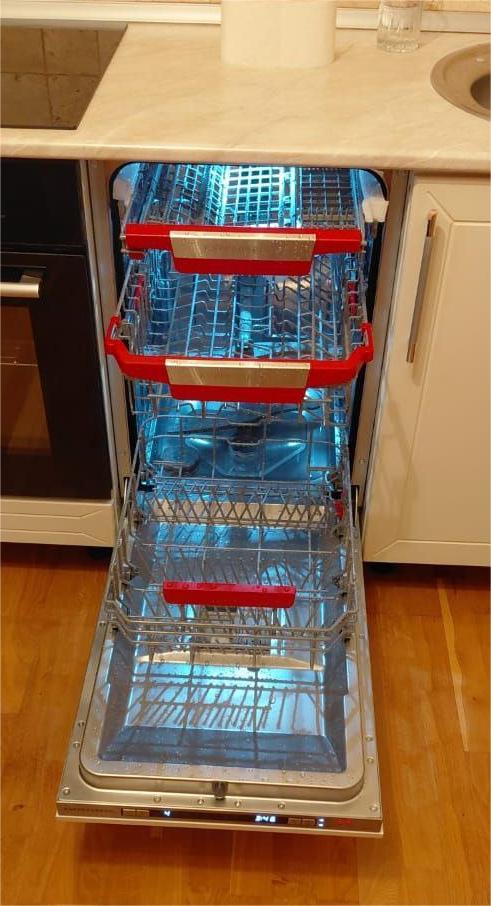 Посудомоечная машина Kuppersberg GLM 4575 стала настоящей находкой для нашей кухни. Узкая модель (всего 45 см в ширину) идеально вписалась в нишу, при этом удивила вместимостью — 11 комплектов посуды хватает даже после крупного застолья. Особенно радует трёхкорзинная система: верхняя и нижняя корзины легко регулируются по высоте, а отдельная корзина для столовых приборов позволяет разместить всё аккуратно и без перекрёстного загрязнения. Качество мойки на высоте — посуда выходит идеально чистой, без жирных пятен и остатков пищи, что подтверждает заявленный класс мытья «А». Конденсационная сушка справляется отлично: стеклянная и керамическая посуда остаётся абсолютно сухой, а пластик, как обычно, чуть влажноват — но это особенность технологии, а не недостаток модели. Внутренняя LED-подсветка — приятный бонус: удобно загружать и выгружать посуду, особенно вечером, когда не хочется включать яркий свет на кухне.