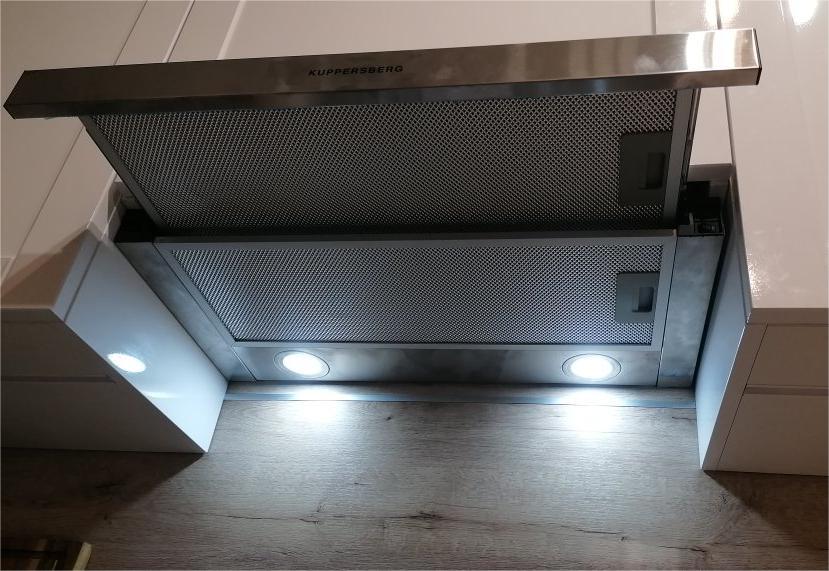 Мне понравилась встроенная вытяжка: мощная, тихая, с LED-подсветкой и удобной выдвижной панелью. Очень!