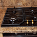 Черная варочная панель с бронзовой фурнитурой, чугунные решётки и удобное управление.
